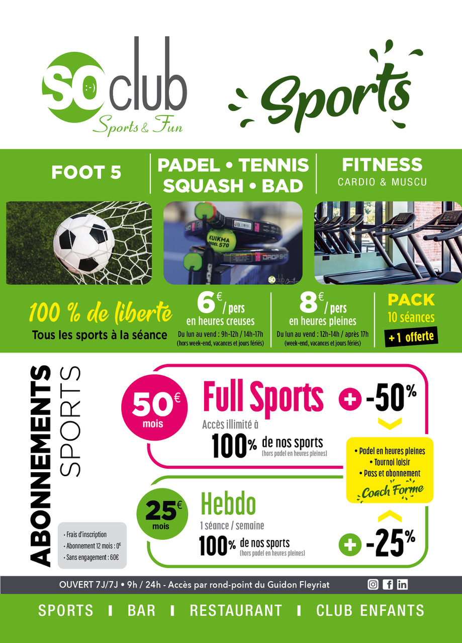 1 Séance / Semaine 100% de nos sports (Hors padel en heures pleines) : Foot, Bad, Squash, Padel, Tennis ou Fitness